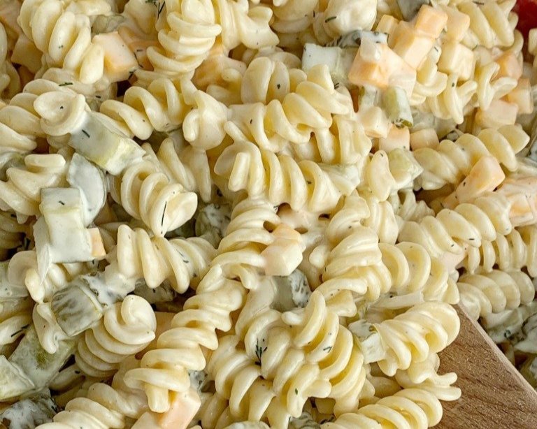 Take the crunch with tangy dill pickles and put it wish pasta for a crowd favorite!